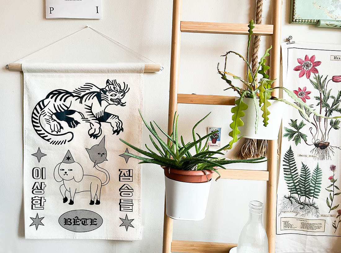 Limited edition tapestry, made in collaboration with Korean-Peruvian artist Isolina Minjeong. Hand-silkscreened on organic canvas in Bushwick, New York City.
